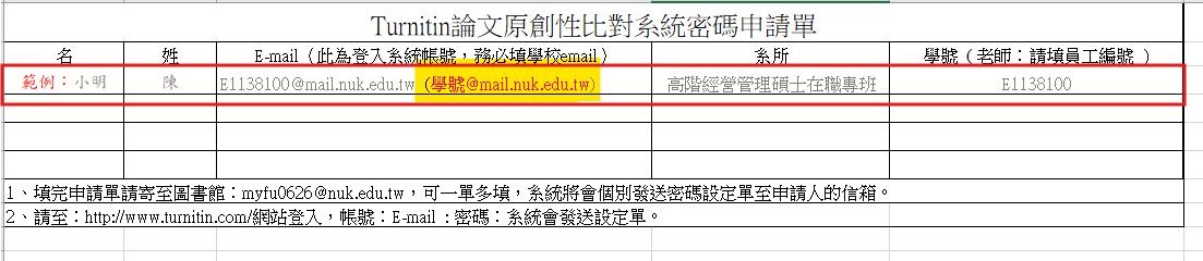 2.填寫「Turnitin論文原創性比對系統密碼申請單」(<--申請單下載),並mail: myfu0626@nuk.edu.tw